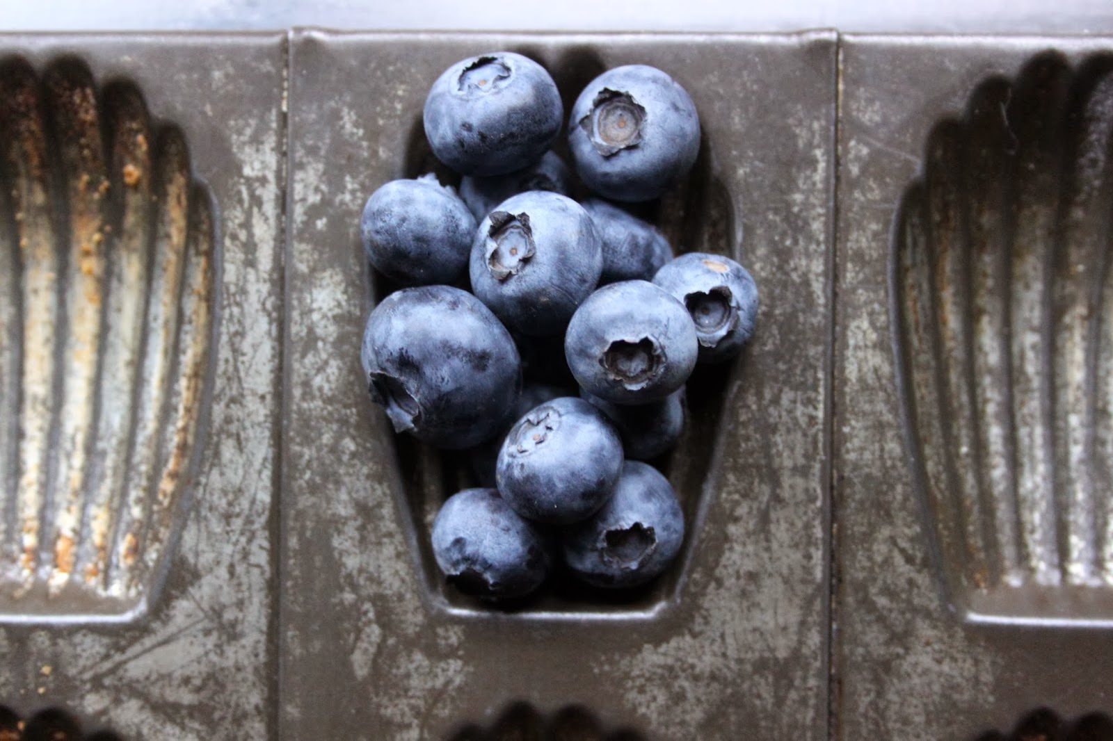 5, Divide the batter into the tins and place a fat blueberry (or two small ones) and gently press them in. They will sink down to the bottom and leave you with that lovely blueberry stain.