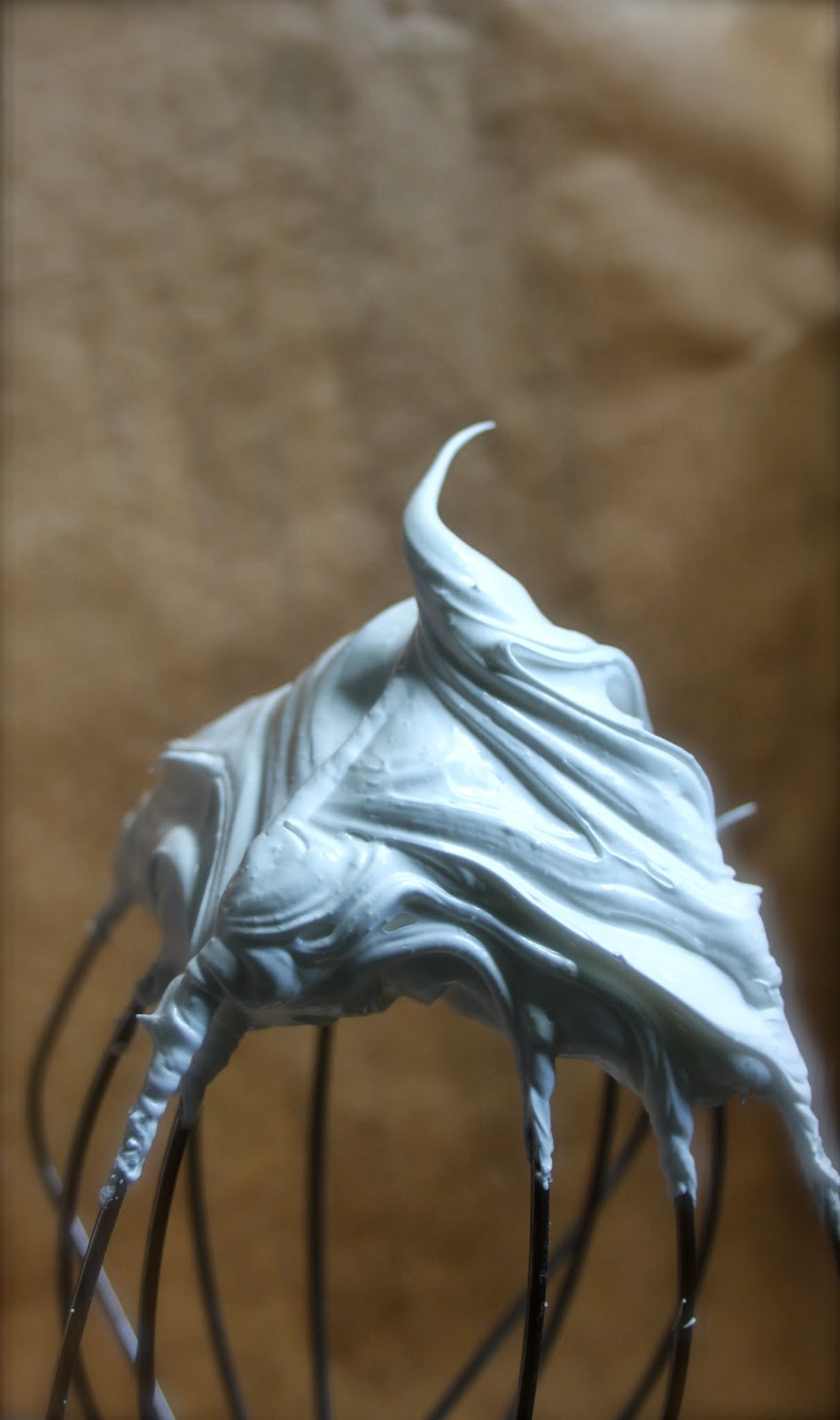 2, Beat the egg whites until they start to foam up and double in size. With the beaters running, slowly add in the caster sugar and drop in that vinegar. This now needs to be beaten until it is a thick glossy white. See beater for reference.
