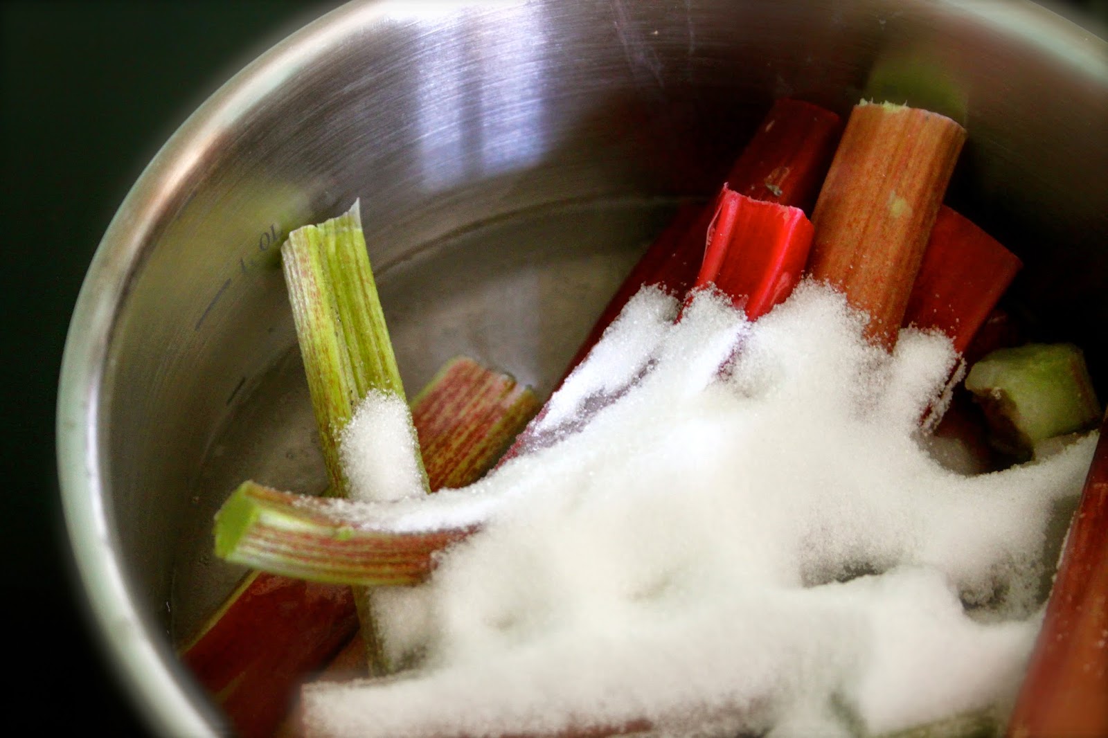 1, Cut the rhubarb into chunks and place in a medium sized saucepan. Toss in the rest of the ingredients and place over a medium heat.
