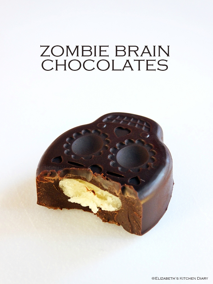 Elizabeth from Elizabeth’s Kitchen Diary‘s entry wraps up the We Should Cocoa round up with her memories of extravagant halloweens and these Zombie Brain Chocolates (BRAAAIIINS!) using some chocolate Día de Muertos moulds.