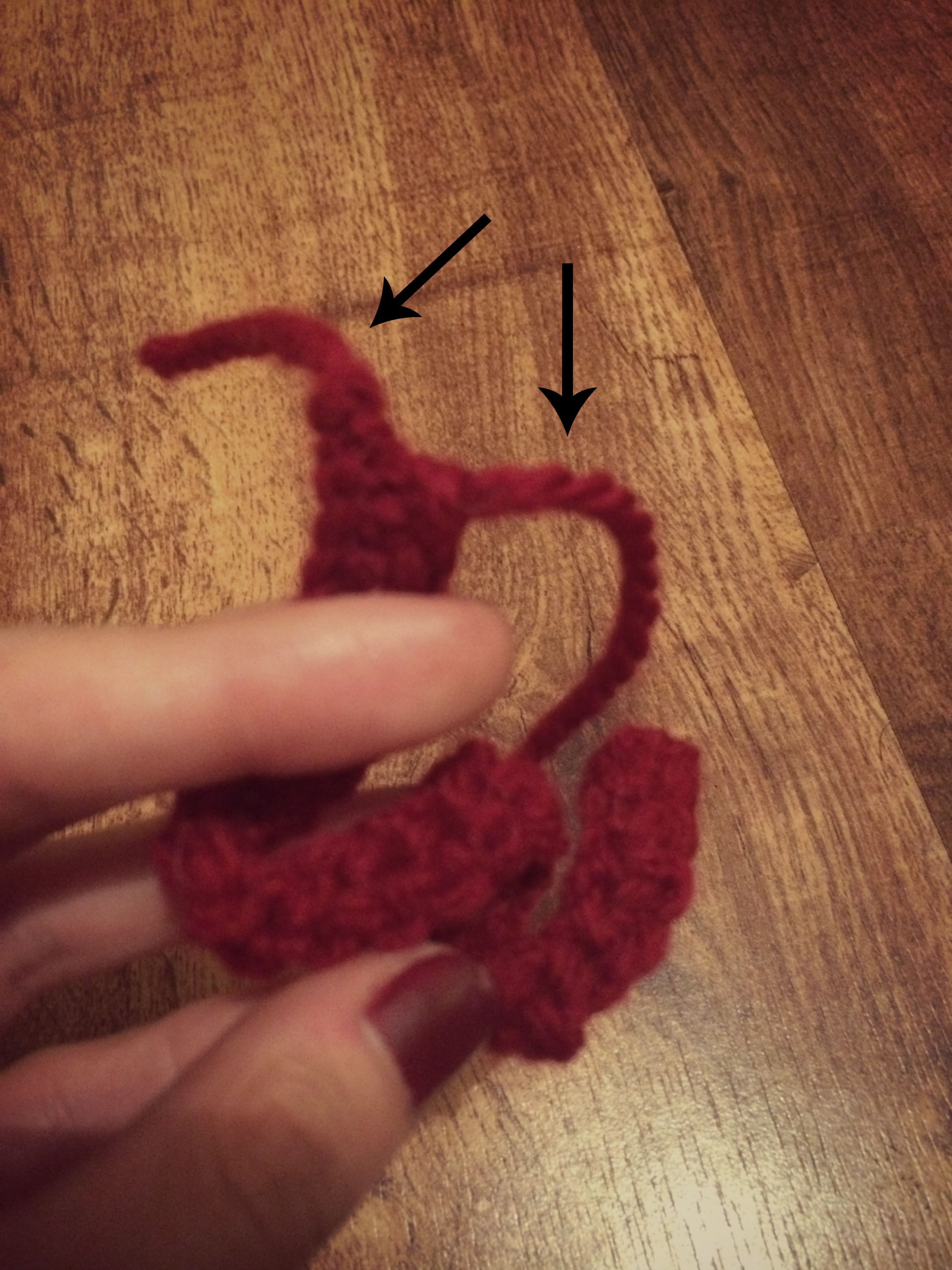 Utilising some of the most basic crochet skills in the history of basic crochet skills, chain around 30 stitches. Longer, if you want a bigger toy. Next, in the second chain from the hook, place a single crochet. You want to place this through one of the loops on the top of your chain. See handy arrow below. Continue along the chain, back towards the tail end, placing single crochets in each top loop. As you crochet along, it will start to curl up.