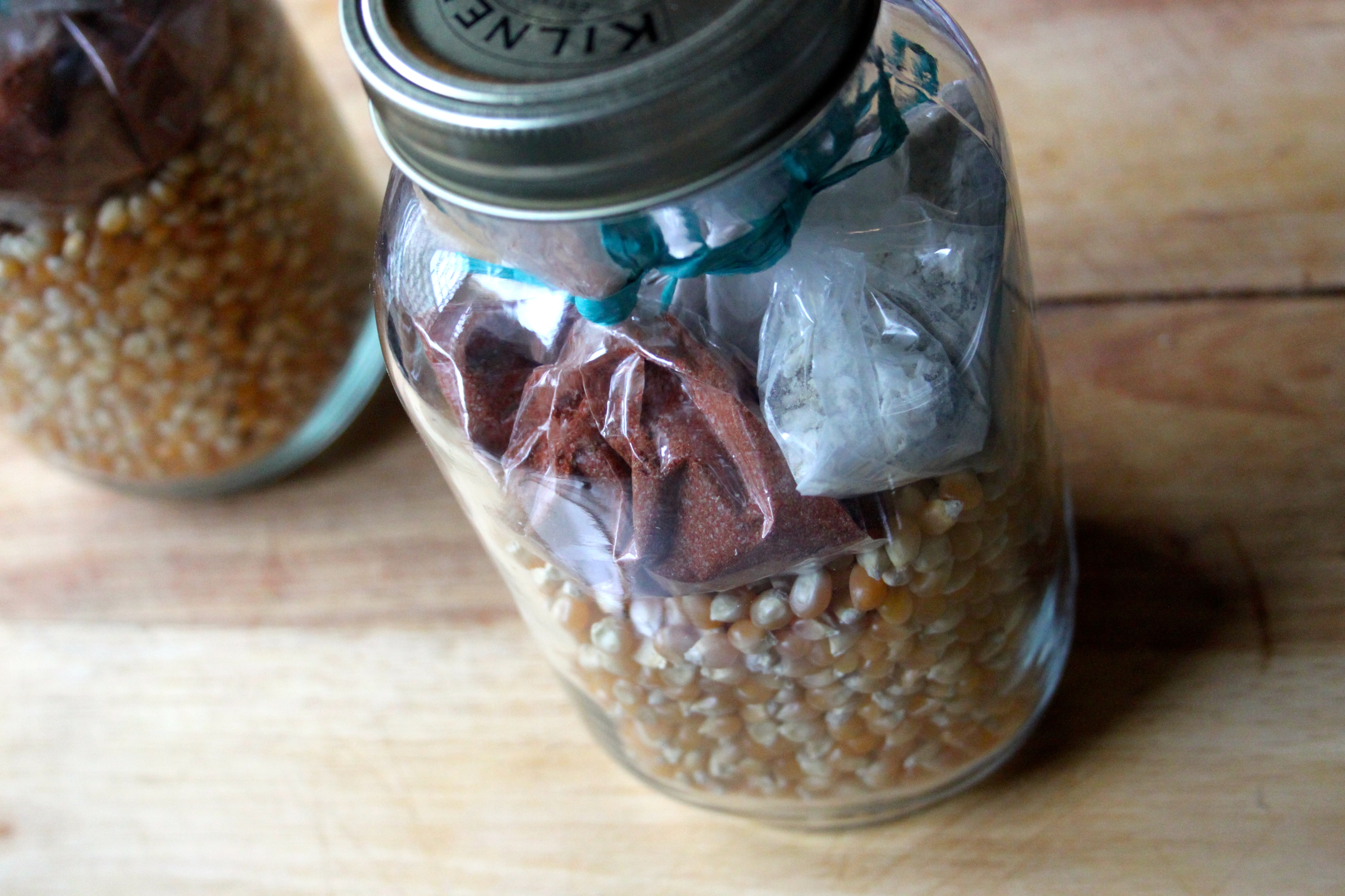 You will need a 1ltr preserving jar, 500gr of popping corn (Holland and Barrett sell it in kilo bags) and dry popcorn flavourings. You can make these up pretty easily – I did a cinnamon sugar, an italian herb and a smoky curry flavour. Bag these up in small cellophane bags and tie them shit Add a label with popping instructions.
