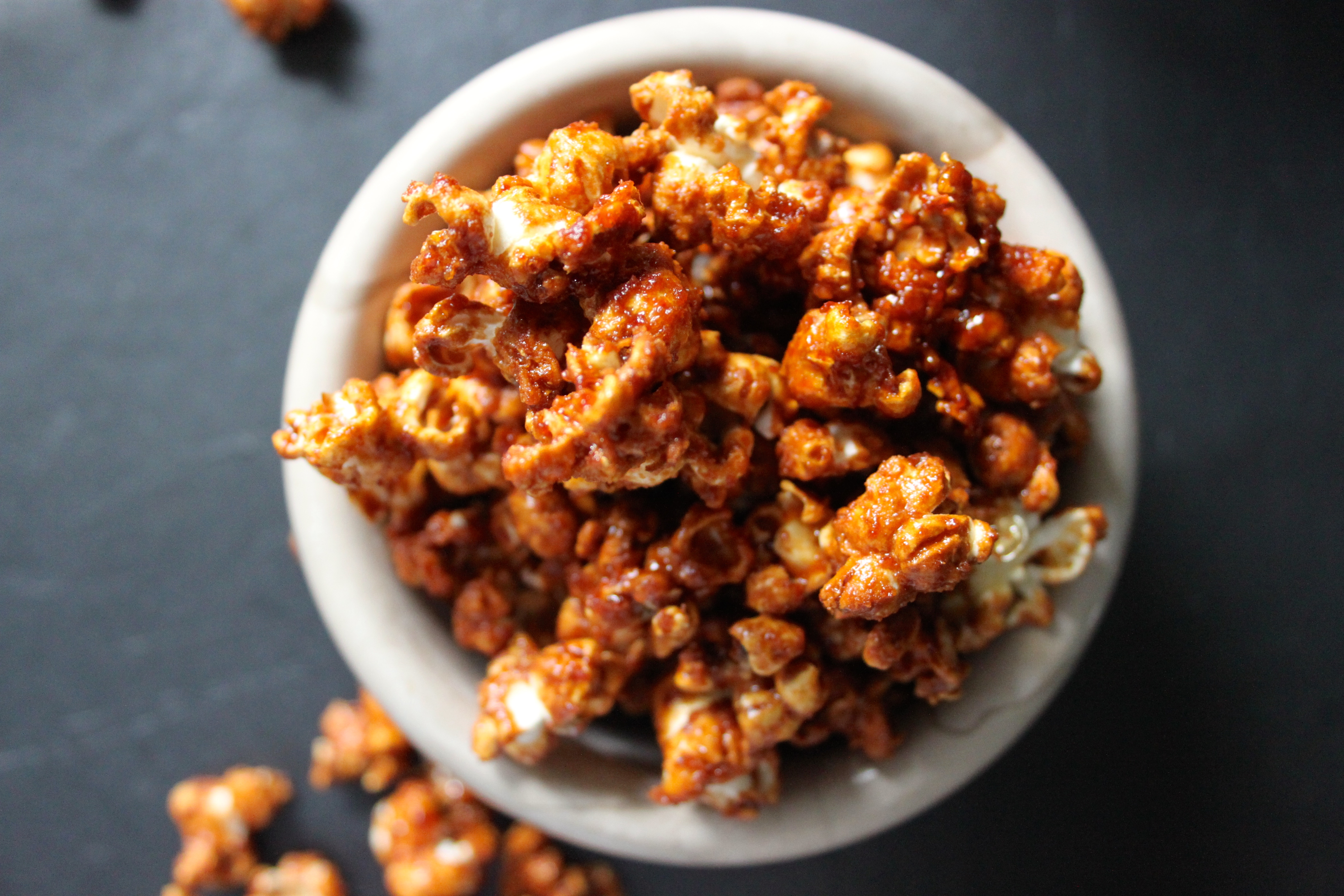 2, Add in the popping corn, pop on the lid and give the whole thing a good shake, from side to side, to coat the corn. Leave the lid on and after a minute or two this should start to pop. Immediately turn the heat down to low and shake the pan everything 15 to 20 seconds to prevent it from burning. When the popping has slowed right down, tip into a large heatproof bowl. You can of course use microwave popcorn or ready made popcorn but you’ll have to eyeball how much you need from the photo before the ingredient list above.